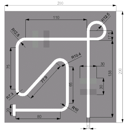 A pista desenrola-se dentro de uma área de 2x2m e é constituída por uma linha com 5cm de largura. O respectivo traçado está indicado na figura 1. O raio de curvatura mínimo, relativo ao bordo interior da linha, é de 7,5cm e a extensão do percurso é de aproximadamente de 6m.