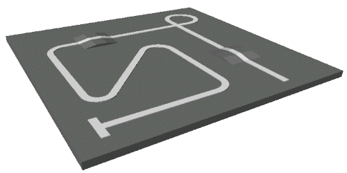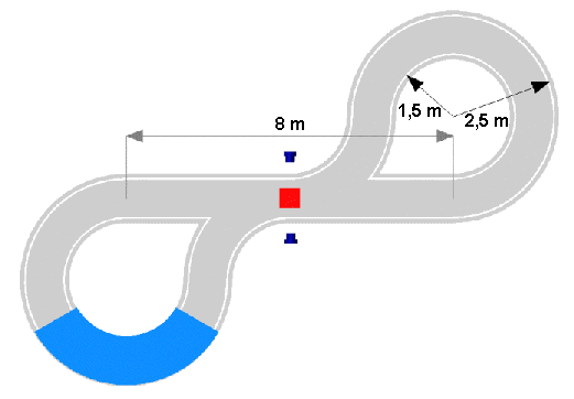 A pista desenrola-se dentro de uma área de 9x13m, possui o formato de estrada e é delimitada por duas linhas laterais e paralelas. O respectivo traçado está indicado na figura 1. O raio de curvatura médio dos troços circulares é de 2m (2,5m raio exterior e 1,5m interior). O troço rectilíneo tem 8m de comprimento. A distância entre linhas, bordo interior, é de 90cm, sendo as estas de 5cm de largura.